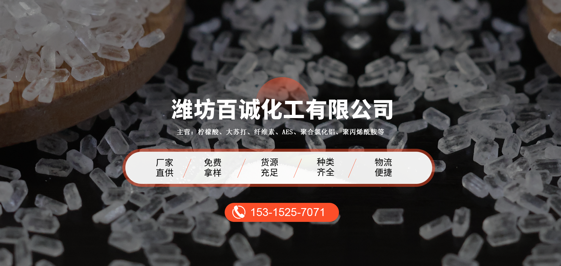 成立于山東的濰坊百誠化工有限公司多年來與國內外多家企業工廠 形成長期合作,形成了競爭力的化工原材料供應、銷售和服務 渠道,主營:大蘇打、葡萄糖、檸檬酸、纖維素、消泡劑、AES等。
